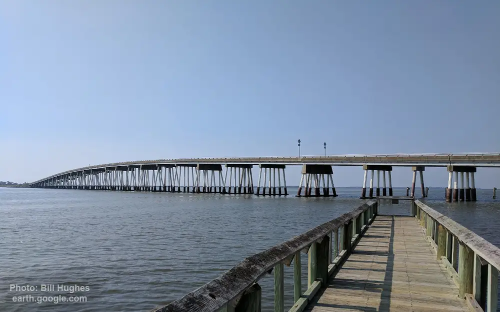 Sinepuxent Bay is an inland waterway which connects Chincoteague Bay to Isle of Wight Bay, and is connected to the Atlantic Ocean via the Ocean City Inlet. It separates Sinepuxent Neck, in Worcester County, Maryland from Assateague Island, and West Ocean City, Maryland from downtown Ocean City. Islands in the Sinepuxent Bay include Horn Island and Skimmer Island. It is crossed by the Harry W. Kelley Memorial Bridge on U.S. Route 50 and the Verrazano Bridge on Maryland Route 611 (not to be confused with the Verrazzano-Narrows Bridge in New York City; both were named for Giovanni da Verrazzano, who explored the coastline in 1524). The bay is the location of the islands that compose the Sinepuxent Bay Wildlife Management Area. Historically the area was referred to by various names including Sinepuxent, Sene Puxon, Synepuxent, Cinnepuxon, et al.[2]